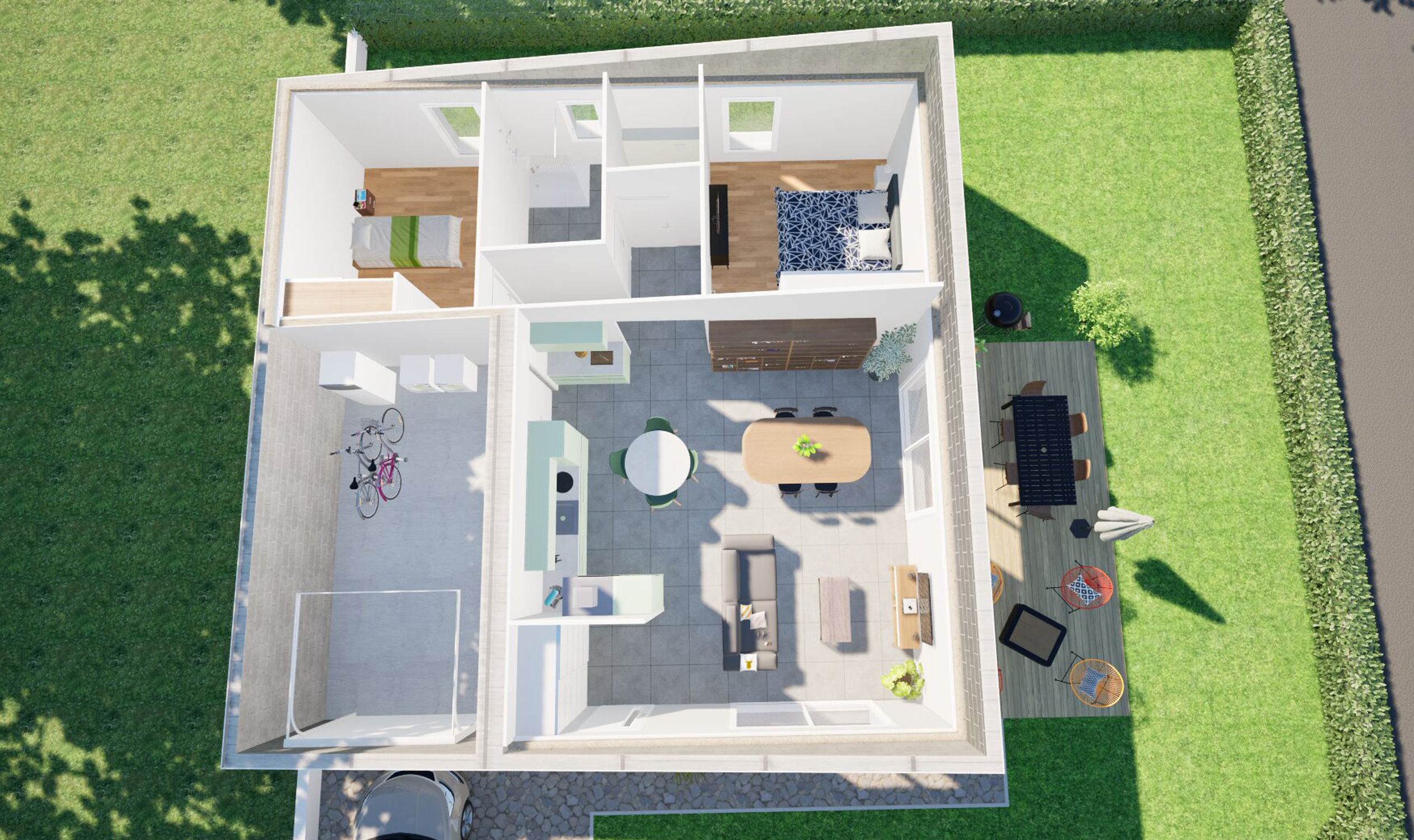 Côté nuit, l’espace est optimisé pour 2 chambres ainsi qu’une salle de bain/toilette séparées.